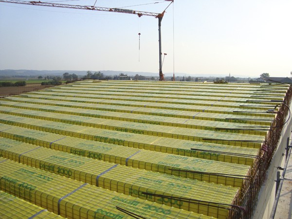 Für Rippen- und Kassettendecken werden vorgefertigte Pecafil® Verdrängungskörper von Hand verlegt und nach Einbringung der Bewehrung betoniert. Durch die variable Formbarkeit der Hohlkörper ist die Planung der Decken an kein festes Deckenrastermaß gebunden.